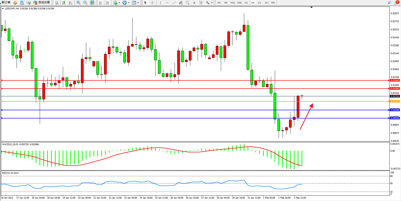 美元瑞郎USDCHF——4小时K线图显示: