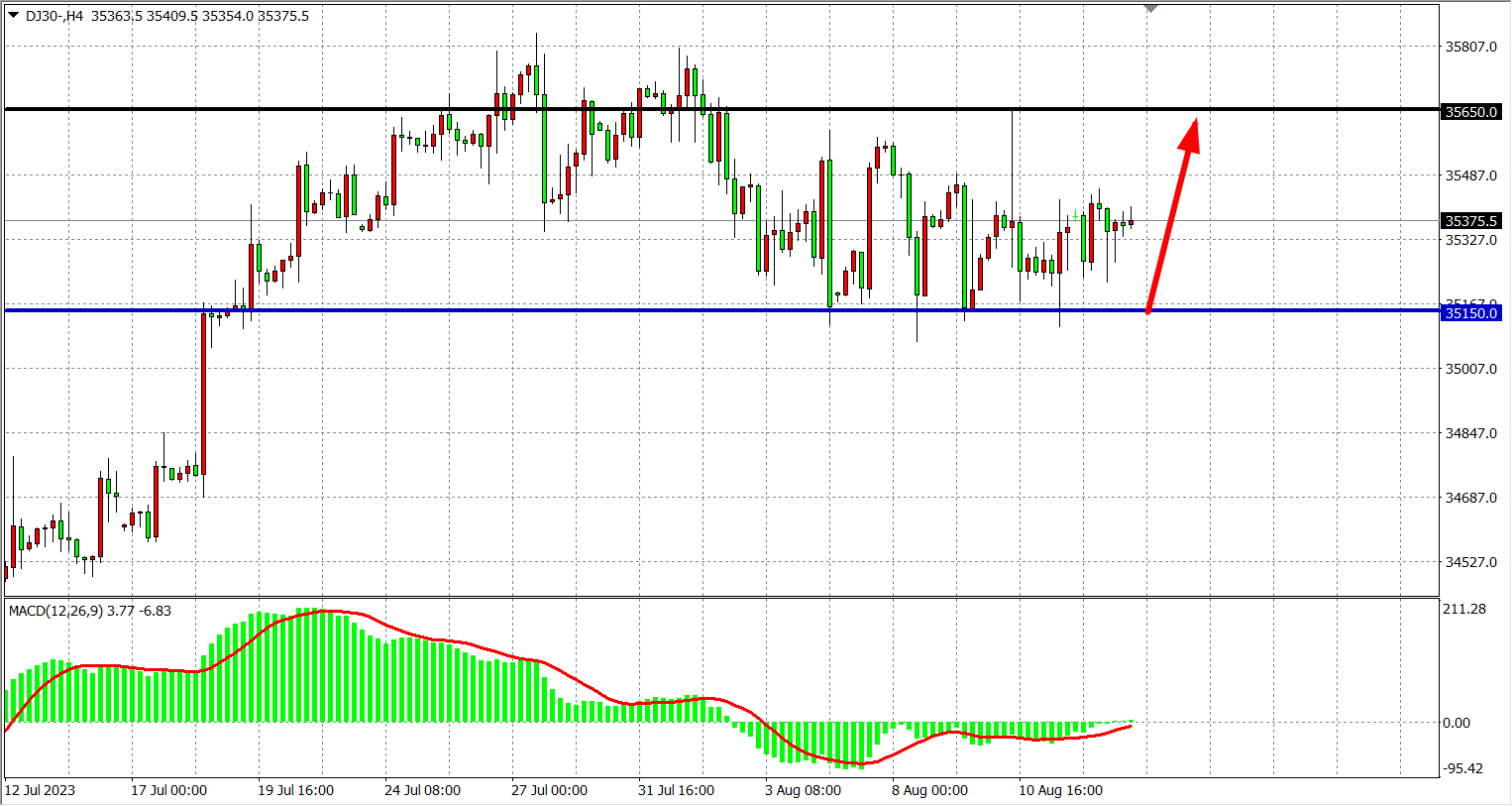 4小时图看,道指在35150附近受支撑反弹,,MACD在零轴下缩量,行情继续维持高位整理,支撑关注35150,阻力关注35650。
